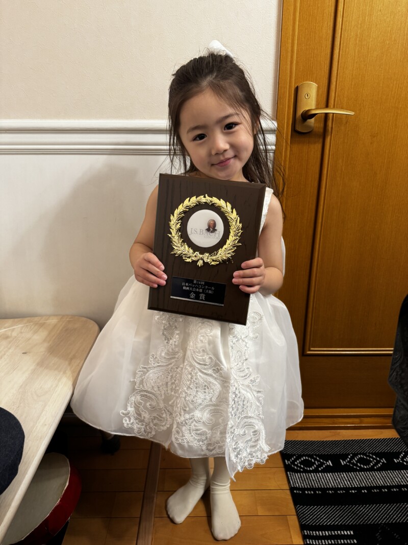 先日の日本バッハコンクールで金賞🥇のiちゃん、今日のレッスンで盾と賞状を持ってきてくれました♪ 4歳のiちゃんには大きい!!重い!! 寒いのに、当日のドレスを着てくれてる💕 思い出のドレスになるね👗